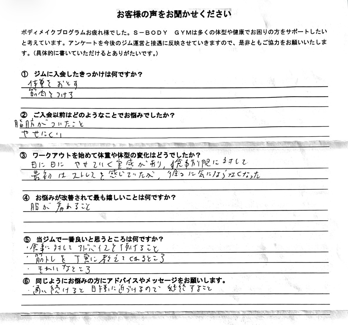来てよかった。と言ってもらえて心から嬉しいです。これからもトレーニングを生活に取り入れていき、より良い生活になるよう願っています。